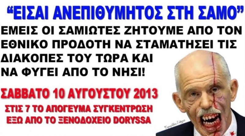 Συγκεκριμένα, κυκλοφόρησαν αφίσα με παραποιημένη φωτογραφία του κ. Παπανδρέου, που τον παρουσιάζει ως... αιμοδιψές ζόμπι και με τίτλο: «Είσαι ανεπιθύμητος στη Σάμο»! Παράλληλα αναφέρουν: «Εμείς οι Σαμιώτες ζητούμε από τον εθνικό προδότη να σταματήσει τις διακοπές του τώρα και να φύγει από το νησί».