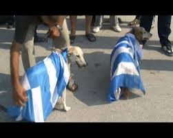Aλβανικό παραλήρημα. Με αφορμή το μνημόσυνο των τριών χρόνων από την δολοφονία του βορειοηπειρώτη Αριστοτέλη Γκούμα στη Χιμάρα και την παρουσία σ' αυτό μελών της Χρυσής Αυγής, Αλβανοί έντυσαν σκυλιά με ελληνικές σημαίες και τα περιέφεραν στο δρόμο.