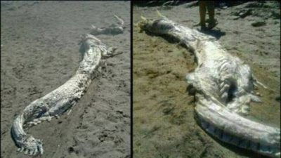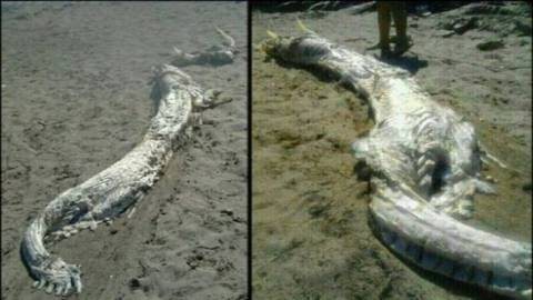Το μήκους τεσσάρων μέτρων άγνωστο πλάσμα, που βρισκόταν σε προχωρημένη κατάσταση αποσύνθεσης, ανακάλυψε μια γυναίκα που έκανε μπάνιο εκείνη την ωρα κι ειδοποίησε τις Αρχές Πολιτικής Προστασίας, οι οποίες έσπευσαν αμέσως στην παραλία… μένοντας με ανοικτό το στόμα. Οι επιστήμονες είδαν με τα μάτια τους ένα λευκό κουφάρι κερασφόρου ζώου με μακρύ σώμα σαν τεράστιο φίδι ή θαλάσσιο δράκοντα.