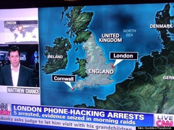 Θα περίμενε κανείς από ένα μεγάλο ειδησεογραφικό κανάλι όπως το CNN, πως οι συνεργάτες του ξέρουν να βρουν στον χάρτη που είναι το Λονδίνο. Και όμως στο δελτίο ειδήσεων που πρόβαλε χθες το βράδυ το CNN, την ώρα που το ρεπορτάζ μιλούσε για τις συλλήψεις και το σκάνδαλο με τις τηλεφωνικές υποκλοπές στην Βρετανία, ο χάρτης έδειχνε το Λονδίνο να βρίσκεται περίπου 120 μίλια πιο μακριά από την κανονική του θέση, κοντά στην θέση του Νόρφολκ. Επίσης ο ίδιος χάρτης έδειχνε την Κορνουάλη ως πόλη. Το twitter γέμισε με μηνύματα που σχολίαζαν την γκάφα του CNN και λίγες ώρες αργότερα το CNN απολογήθηκε μέσω twitter και διαβεβαίωσε τους θεατές του πως έχει διορθώσει τους χάρτες του. iefimerida.gr
