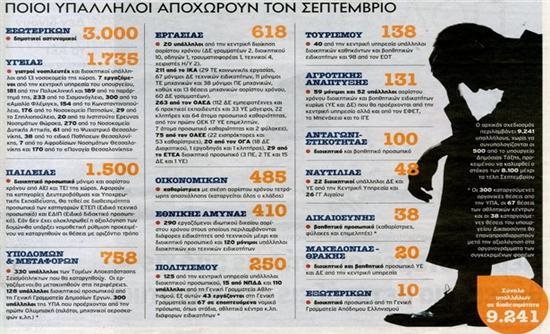 Στην κυβερνητική σύσκεψη οριστικοποιήθηκαν οι 8.100 εργαζόμενοι που θα τεθούν σε κινητικότητα στις 23 Σεπτεμβρίου, ήδη από τον Ιούλιο έχουν ενταχθεί στο πρόγραμμα 4.400 υπάλληλοι. Μέσα στην εβδομάδα οι υπουργοί θα πρέπει να έχουν υπογράψει κοινές υπουργικές αποφάσεις σύμφωνα με τις οποίες θα καταργούνται οργανικές θέσεις από φορείς του Δημοσίου.