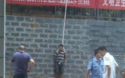 Απίστευτη τιμωρία για έναν 34χρονο διαρρήκτης στην Κίνα. Ο νεαρός πιάστηκε «επ' αυτοφώρω» στην ώρα που έβγαινε από ένα διαμέρισμα να έχει κλέψει ένα iPad, δύο ρολόγια, δύο κινητά τηλέφωνα και ένα λάπτοπ. Οι άνδρες της ασφάλειας που φρουρούσαν το σύμπλεγμα κατοικιών στην περιοχή Wuhan της επαρχίας Hubei της Κίνας του έδεσαν τα χέρια, του έβαλαν ένα σχοινί κάτω από τους ώμους του και γύρω από το λαιμό του και τον «κρέμασαν» για πέντε ώρες από έναν τοίχο ύψους 6 μέτρων. Οι φρουροί έδεσαν τα μάτια του διαρρήκτη και τον τοποθέτησαν δίπλα στα πράγματα που είχε κλέψει με μία πινακίδα στα πόδια που εξηγούσε τι είχε κάνει. Τελικά η αστυνομία κλήθηκε πέντε ώρες αργότερα και τώρα βρίσκεται σε εξέλιξη έρευνα σε βάρος των «τιμωρών» του. makeleio