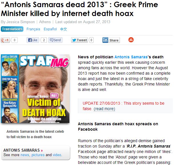 Τη Δευτέρα 26 Αυγούστου-σύμφωνα πάντα με τα γραφόμενα της γαλλικής ιστοσελίδας- επιβεβαιώθηκε επίσημα ότι ο Αντώνης Σαμαράς δεν είναι νεκρός. "Αυτός ενώνει τη μακρά λίστα των διασημοτήτων που έχουν πέσει θύματα αυτής της φάρσας".Ανέφεραν χαρακτηριστικά: "Είναι ζωντανός και καλά, και να σταματήσετε να πιστεύετε ό, τι βλέπετε στο Διαδίκτυο ".