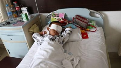 Η τηλεόραση της επαρχίας Σανσί πρόβαλε ένα βίντεο στο οποίο εικονίζεται το παιδί, που πλέον είναι τυφλό, στο κρεβάτι ενός νοσοκομείου, με καλυμμένες τις κόχες των ματιών με επιδέσμους.