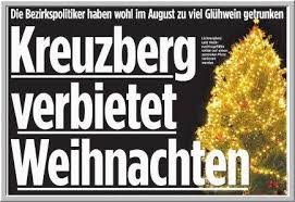 Τα Χριστούγεννα απαγορεύονται στην περιοχή Kreuzberg του Βερολίνου - τουλάχιστον όσον αφορά τον εορτασμό σε δημόσιους χώρους. Τα Χριστούγεννα επιτρέπονται πλέον, μόνο στο σπίτι, έτσι ώστε να μην «τραυματίζονται» τα θρησκευτικά συναισθήματα των «άλλων».