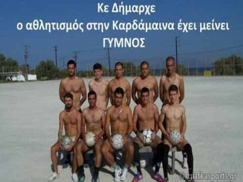 Οι παίκτες της ομάδας φωτογραφήθηκαν γυμνοί για να αποδείξουν στον Δήμαρχο ότι «ο αθλητισμός στην Καρδάμαινα έχει μείνει γυμνός».