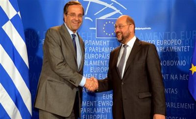 Ολοκληρώθηκε η συνάντηση του Έλληνα πρωθυπουργού Αντώνη Σαμαρά με τον πρόεδρο του Ευρωπαϊκού Κοινοβουλίου Μάρτιν Σουλτς.