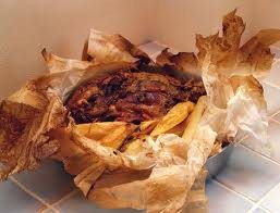 - Κόβετε 6 κομμάτια αλουμινόχαρτο, 60-70 πόντων περίπου το καθένα, βάζετε τις μερίδες του κρέατος στα κομμάτια του αλουμινόχαρτου.