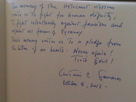 Ο πρωθυπουργός ευγενικά αρνήθηκε να φορέσει το κιπά το εβραικό καπέλο που είναι σύμβολο πίστης. Έγραψε ο πρωθυπουργός: "Η μνήμη των θυμάτων του Ολοκαυτώματος, μας καλεί να παλέψουμε για ανθρώπινη αξιοπρέπεια. Να παλέψουμε ασταμάτητα εναντίον του φασισμού και εναντίον κάθε μορφής τυρανία. Η μνήμη τους μας καλεί να φωνάξουμε από τα βάθη της καρδιάς μας: Ποτέ Ξανά!" newsit