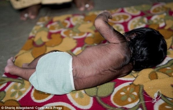 Έχει τρίχες σε όλο του το κορμάκι. Από το κεφαλάκι του μέχρι τα πατουσάκια του. Γεννήθηκε πριν λίγους μήνες στην Ινδία, με το σύνδρομο του λυκανθρώπου. Η μητέρα του, το κρατάει σφικτά στην αγκαλιά της, ενώ ανησυχεί πολύ για το μέλλον του. Η συγκεκριμένη ασθένεια ονομάζεται έτσι, γιατί όσοι νοσήσουν από αυτήν, μοιάζουν εμφανισιακά με το μύθο του Λυκανθρώπου, εκτός βέβαια από τα δόντια και τα νύχια. Δείτε τις φωτογραφίες που κάνουν το γύρο του κόσμου με το μωρό στην αγκαλιά της μητέρας του: