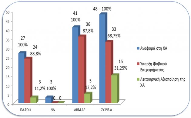 ΠΑ.ΣΟ.Κ: Υψηλή κινητικότητα αναφορικά με την Χρυσή. Απόδοση αιτιότητας ανόδου της Χρυσής Αυγής στην οικονομική κρίση ,όχι στις δομικές αδυναμίες του πολιτικού συστήματος. Στόχος Λειτουργικής Αξιοποίησης της Χρυσής Αυγής: 1.Αντιπολίτευση(ΣΥ.ΡΙΖ.Α) 2.Κυβέρνηση(σε μικρότερο βαθμό). Το κόμμα παρουσιάστηκε σε μερικά Δελτία Τύπου σε όρους «αντικυβερνητικούς» Δόμηση ταυτότητας δια της ετερότητας(αδύναμη εκλογική θέση) και δια της ιδεολογίας.