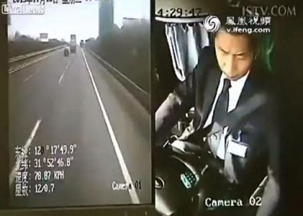 Είναι γνωστοί οι κίνδυνοι της χρήσης του κινητού τηλεφώνου κατά την οδήγηση. Στο βίντεο που θα δείτε ένας οδηγός λεωφορείου στην Κίνα έβγαλε το κινητό του για να δει ένα sms που είχε λάβει. Αυτό είχε σαν συνέπεια να χάσει την αυτοσυγκέντρωσή του και να πέσει πάνω σε προπορευόμενο φορτηγό. Ευτυχώς όπως αναφέρουν τα τοπικά ΜΜΕ δεν υπήρξαν θύματα. Το περιστατικό κατέγραψε η κάμερα ασφαλείας του λεωφορείου. enikos