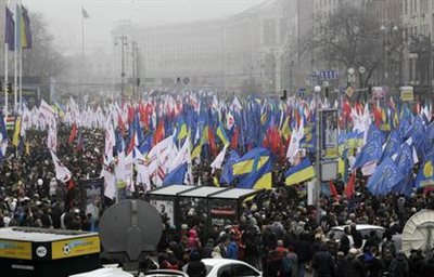 Φωνάζοντας συνθήματα όπως "Κάτω η συμμορία!", "Θέλω να ζω στην Ευρώπη" και "Η Ουκρανία είναι τμήμα της Ευρώπης" και κρατώντας σημαίες της ΕΕ πολλές χιλιάδες Ουκρανοί πραγματοποίησαν σήμερα πορεία στην πρωτεύουσα Κίεβο καταγγέλλοντας τον πρόεδρο Βίκτορ Γιανουκόβιτς για την αναδίπλωσή του προς όφελος της Ρωσίας.