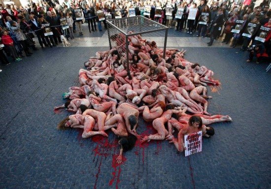 Μέλη της φιλοζωικής οργάνωσης Anima Naturalis, οι οποίοι «βούτηξαν» γυμνοί μέσα στο αίμα σε κεντρική πλατεία της Ευρώπης.