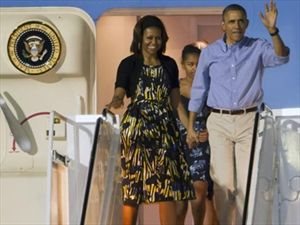 Ο Ομπάμα με τη σύζυγό του Μισέλ και τις κόρες τους Μάλια και Σάσα, καθώς και με την Μάριαν Ρόμπινσον, τη μητέρα της κυρίας Ομπάμα, βγήκαν από το προεδρικό αεροπλάνο Air Force One φορώντας άνετα ρούχα έπειτα από μια πτήση εννιάμισι ωρών. Οι πρώτοι σκύλοι Μπο και Σάνι ήταν επίσης παρόντες.