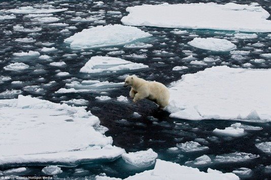 Ο 30χρονος φωτογράφος Marco Gaiotto εντόπισε πολλές πολικές αρκούδες να προσπαθούν να διατηρηθούν σε κομμάτια παγόβουνων για να εξακολουθήσουν να κυνηγούν φώκιες για την επιβίωσή τους.