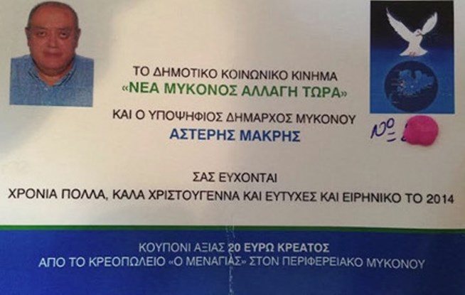 Το φαινόμενο του να εκδίδει και να μοιράζει κουπόνια για να διαφημίσει τον εαυτό του εν όψει εκλογών κάποιος υποψήφιος δεν είναι ασυνήθιστο, ωστόσο, στη Μύκονο το πήγαν ένα βήμα παραπέρα.Οπως αναφέρει ο ιστότοπος cyclades24, επικαλούμενος τον τοπικό ιστότοπο της Μυκόνου mykonoszoo, ο επικεφαλής της κίνησης «Νέα Μύκονος – Αλλαγή Τώρα», Αστέρης Μακρής, μοίραζε κουπόνια με ένα ξεχωριστό δώρο. Αυτό ήταν ένα κουπόνι αξίας 20 ευρώ με δώρο κρέας από γνωστό κρεοπωλείο του νησιού. Αυτή η κίνηση του υποψήφιου δημάρχου έγινε ενώπιον των εορτών Χριστουγέννων και για την Καλή χρονιά.