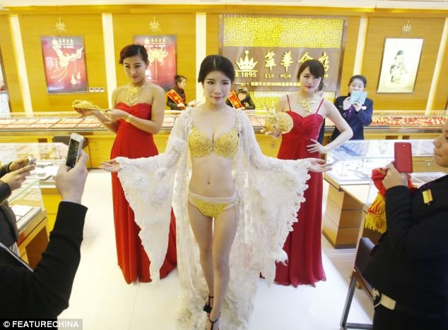 Το μοντέλο που βλέπετε στις φωτογραφίες ποζάρει σε γκαλερί στην κεντρική επαρχία της Κίνας Χουμπέι , φορώντας τα χρυσά εσώρουχα μαζί με χρυσά αξεσουάρ και κυριολεκτικά ... λάμπει. Χιλιάδες επισκέπτες επισκέπτονται το κατάστημα και φωτογραφίζουν τα χρυσά εσώρουχα .