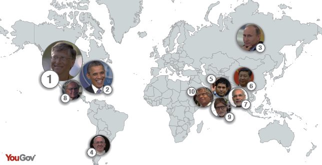 Σε μία έρευνα που έκανε η εταιρεία YouGov σε 13 χώρες του κόσμου, σε περίπου 14.000 άνθρωπους, ο ιδρυτής της Microsoft, Μπιλ Γκέιτς αποδεικνύεται ως η πλέον δημοφιλής προσωπικότητα στον πλανήτη.Η έρευνα έγινε για προσωπικότητες που βρίσκονται εν ζωή και ο Μπιλ Γκέιτς έχει τα πρωτεία (10,10%), αφήνοντας στη δεύτερη θέση τον Μπαράκ Ομπάμα (9,27%).