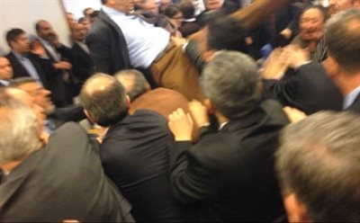 Ένας βουλευτής ανέβηκε πάνω σε ένα γραφείο κι αποπειράθηκε να καταφέρει μια κλωτσιά πηδώντας από αυτό, άλλοι πάλεψαν και γρονθοκοπήθηκαν, ενώ φάκελοι με έγγραφα, πλαστικά μπουκάλια με νερό, ακόμα και ένα tablet, εκτοξεύτηκαν από τους αντιπάλους, σύμφωνα με έναν ανταποκριτή του πρακτορείου ειδήσεων Reuters ο οποίος ήταν παρών στην αίθουσα.