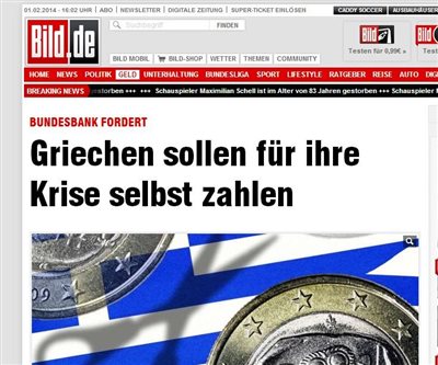 Η ελληνική κρίση είναι αντικείμενο εκτενούς πρωτοσέλιδου ρεπορτάζ της εφημερίδας Bild που με το γνωστό ύφος της αναφέρεται στην πρόσφατη πρόταση της Bundesbank για επιβολή εισφοράς περιουσίας για τους εύπορους πολίτες των χωρών της κρίσης. Η εφημερίδα επισημαίνει ότι σύμφωνα με την Ομοσπονδιακή Τράπεζα της Γερμανίας, «Οι Έλληνες πρέπει να πληρώσουν μόνοι για την κρίση τους».