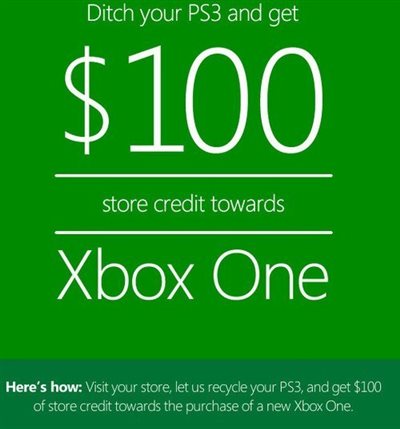 Μια αρκετά επιθετική διαφημιστική καμπάνια ξεκίνησε η Microsoft στις Η.Π.Α. με σκοπό να προωθήσει τις πωλήσεις του Xbox One.Όποιος λοιπόν αποσύρει το παλιό του PS3, στα συνεργαζόμενα καταστήματα (βλ.Microsoft Stores στις Η.Π.Α.) κερδίζει έκπτωση $100 στην αγορά του Xbox One. Με τον τρόπο αυτό, η διαφορά τιμής ανάμεσα στο Xbox One και το PS4 πρακτικά μηδενίζεται μιας και η τιμή του Xbox One διαμορφώνεται πλέον στα $399 (μετά έκπτωσης)… όσο δηλαδή και του PS4. Η απάντηση των χρηστών ήταν φυσικά άμεση και δεν άργησε να κυκλοφορήσει στο διαδίκτυο το παρακάτω χιουμοριστικό banner (που περιέχει μεγάλη δόση αλήθειας):