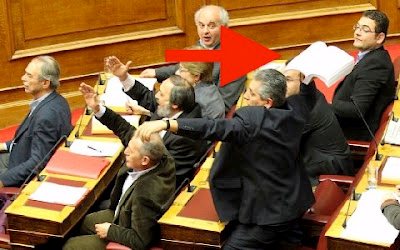 Ο φωτογραφικός φακός κατέγραψε τον βουλευτή του ΚΚΕ Γιώργος Μαυρίκος, την στιγμή που πέταξε προς τα υπουργικά έδρανα της Ολομέλειας τον ογκώδη τόμο του νομοσχεδίου. Στόχος του βουλευτή ήταν.... ο Ε. Βενιζέλος, τον οποίον τελικά δεν πέτυχε..
