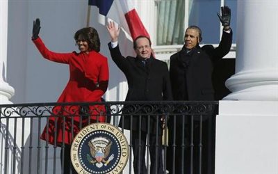 Ο Ολάντ, τον οποίο υποδέχθηκε στον Λευκό Οίκο ο Αμερικανός ομόλογός του Μπαράκ Ομπάμα, υπογράμμισε ότι οι δύο χώρες συνεργάζονται για να αντιμετωπίσουν "τη διάδοση των όπλων μαζικής καταστροφής", να επιλύσουν "τις κρίσεις στη Μέση Ανατολή", να βοηθήσουν "στην ανάπτυξη της Αφρικής" και να αγωνιστούν για την αντιμετώπιση της κλιματικής αλλαγής.