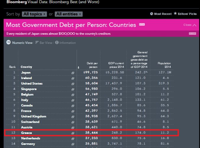 Την ώρα που πολύς λόγος γίνεται για τα χρήματα που χρωστά η Ελλάδα, μελέτη του Bloomberg προσεγγίζει διαφορετικά το θέμα “χρέος” και δείχνει μια άλλη οπτική. Έτσι χώρες που θεωρούνται πρότυπα για την Ελλάδα και επιτυχημένα παραδείγματα δημοσιονομικής πολιτικής, βρίσκονται υψηλότερα από την Ελλάδα στο κατά κεφαλή χρέος, δηλαδή στην κατάταξη που δείχνει πόσο χρωστάει ο κάθε πολίτης της εκάστοτε χώρας.