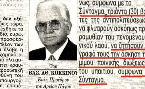 Σύμφωνα με το Σύνταγμα αρκούν μόνο 30 Βουλευτές για να ζητήσουν την άσκηση της Ποινικής Δίωξης του…! Όπως πάντα βαρυσήμαντο το άρθρο του Β. Κόκκινου π. Προέδρου του Αρείου Πάγου στην εφημερίδα “Αξία”. Αφού περιγράφει και εξηγεί τις ευθύνες του Πρωθυπουργού γιά την οικονομική κρίση, με κομβικό σημείο ότι μας οδήγησε προμελετημένα στην μέγγενη του Δ.Ν.Τ., δεδομένου ότι «εκτός των άλλων» αρνήθηκε και το δάνειο Πούτιν 20 δις ευρώ, με την αδιαμφισβήτητη νομική του κατάρτιση παραπέμπει σε διατάξεις του Ποινικού Κώδικα και άρθρων του… Συντάγματος πού στοιχειοθετούν το αδίκημα της Εξαπάτησης του Ελληνικού Λαού. Για δε την παραπομπή του δεν απαιτείται τίποτα παραπάνω από 30 υπογραφές Βουλευτών πού μπορούν να ζητήσουν… την άσκηση… ποινικής δίωξης …!  arouraios