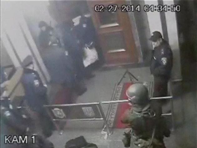 Μια φωτογραφία από κάμερα ασφαλείας μέσα στη Βουλή της Κριμαίας δείχνει τους ένοπλους Ρώσους που έχουν υπό τον έλεγχό τους το κτίριο να παρακολουθούν τους υπαλλήλους που αποχωρούν. Είναι ντυμένοι με στρατιωτικές στολές χωρίς διακριτικά και βαρειά οπλισμένοι. Είναι προφανές ότι πρόκειται για Ρώσους οι οποίοι μεθοδικά εκτελούν σχέδιο στρατιωτικής επέμβασης στην Κριμαία. Η επέμβαση προκάλεσε ήδη την αμερικανική αντίδραση.