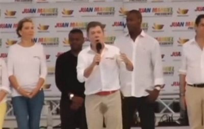 Το βίντεο που καταγράφει το… συμβάν, είναι από την σημερινή ομιλία του Προέδρου Χουάν Μανουέλ Σάντος στην πόλη Μπαρανκίλα, όπου υποσχέθηκε ότι αν εκλεγεί θα προωθήσει σχέδιο δημιουργίας 2,5 εκατομμυρίων θέσεων εργασίας.