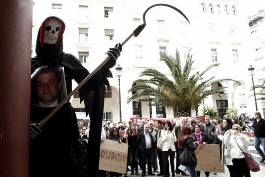 Οι εργαζόμενοι του ΨΝΘ διαμαρτυρήθηκαν για τη διαθεσιμότητα των 13 οδηγών του νοσοκομείου... Μάλιστα, ένας από αυτούς, μεταμφιεσμένος σε... Χάρο ανέβηκε στη βάση μιας κολόνας κουνώντας το δρεπάνι του (κεντρική φωτό).