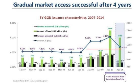 Ειδική μνεία σε ξεχωριστό πίνακα γίνεται στην διαχρονική εξέλιξη των επιτοκίων των ελληνικών ομολόγων και μάλιστα στην επίτευξη ανταγωνιστικού επιτοκίου μετά την πρόσφατη έξοδο στις αγορές.