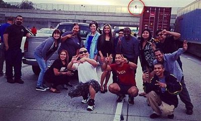 Ακριβώς πίσω τους υπήρχε μια γέφυρα .Εκεί ήταν ένας άντρας ο οποίος απειλούσε να πέσει. Η αστυνομία είχε κλείσει το δρόμο προκειμένου να τον μεταπείσουν. Η παρέα όμως δεν... πτοήθηκε και η στιγμή απαθανατίστηκε χωρίς να δίνουν και πολύ σημασία για το αν ένας συνάνθρωπος θα αυτοκτονούσε.