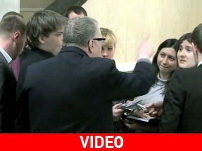 Ο Zhirinovsky απάντησε σπρώχνοντας τους βοηθούς του και παροτρύνοντας να φιλήσουν την έγκυο γυναίκα.