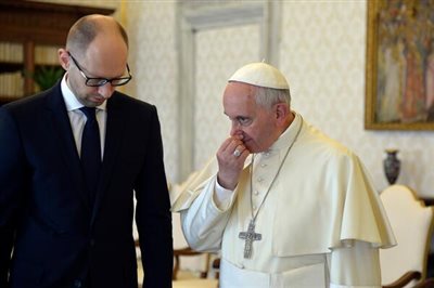 Ο Πάπας Φραγκίσκος υποδέχθηκε το Σάββατο στο Βατικανό τον Πρωθυπουργό της Ουκρανίας, Αρσένι Γιατσένιουκ και δεσμεύθηκε να βοηθήσει με όποιο τρόπο μπορεί για να επανέλθει η ηρεμία στην περιοχή.