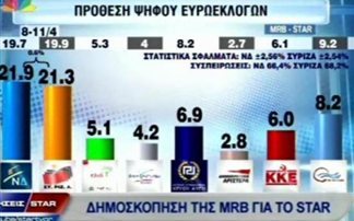 Προβάδισμα 1,5 μονάδας στην εκτίμηση ψήφου των βουλευτικών εκλογών δίνει στη Νέα Δημοκρατία έναντι του ΣΥΡΙΖΑ νέα δημοσκόπηση της MRB για λογαριασμό του Star, η οποία διενεργήθηκε μεταξύ 28 και 30 Απριλίου.