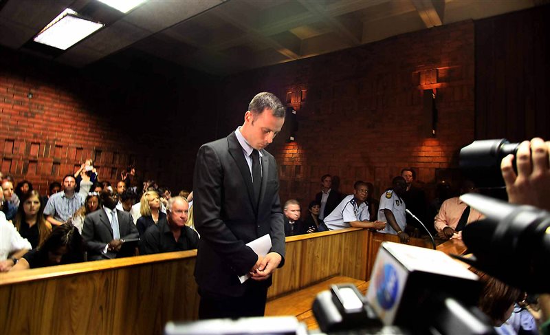 Όπως μεταδίδει η Πούμζα Φιλανί του BBC από το δικαστήριο στην πρωτεύουσας της Νότιας Αφρικής, της Πρετόριας, ο Πιστόριους εμφανίστηκε σήμερα στη δίκη με μαύρο κοστούμι, μαύρη γραβάτα, λευκό πουκάμισο, μαύρα γυαλιά ηλίου και κομμένα τα μαλλιά του.