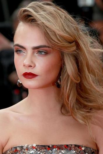 Το μακιγιάζ της Cara δεν έχει καθόλου μολύβια και γραμμικά σχέδια! Έχει φωτίσει ίσα- ίσα τα μάτια της με μια σκιά στο χρώμα της άμμου, shimmering μπεζ στην εσωτερική γωνία για να δώσει λάμψη ενώ στα χείλη έχει βάλει ένα καθαρό κόκκινο κραγιόν. Το σήμα κατατεθέν κάθε red carpet event!