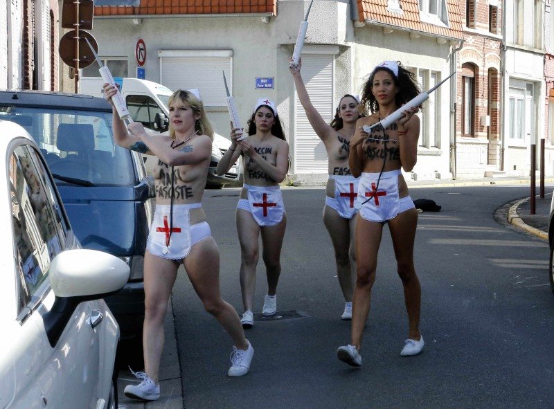 Οι γυμνόστηθες κοπέλες όπως σημειώνει η Le Figaro κρατώντας μεγάλες σύριγγες στα χέρια παρότρυναν τους Γάλλους ψηφοφόρους πριν μπουν στο εκλογικό κέντρο για να ψηφίσουν να κάνουν το αντιφασιστικό εμβόλιο. Μάλιστα φώναζαν και τα απαραίτητα συνοδευτικά συνθήματα όπως: