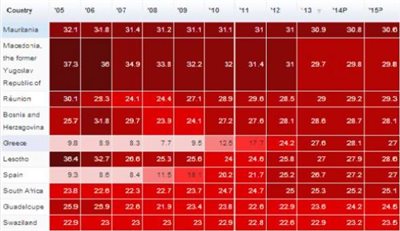 Η χώρα μας έχει το 5ο υψηλότερο ποσοστό ανεργίας (27,6%). Στην πρώτη θέση βρίσκεται η Μαυριτανία (30,9%), στη δεύτερη τα Σκόπια (29,7%), στην τρίτη η Reunion,αποικία της Γαλλίας, βρίσκεται ανατολικά της Μαδαγασκάρης, με 29% και την πρώτη τετράδα συμπληρώνει η Βοσνία με 28,6%.