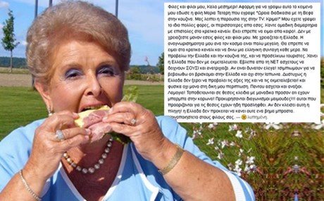 Έκκληση κάνει η Βέφα Αλεξιάδου να κάνουν διαμαρτυρία οι Έλληνες έξω από το κρατικό κανάλι για να την προσλάβουν και να κάνει εκπομπή. Με ανάρτησή της στο facebook, η γνωστή μαγείρισσα τα βάζει με εκείνους που έχουν καταλάβει θέσεις κλειδιά και ζητά να αποκτήσει τη δική της εκπομπή. Όπως λέει στο κείμενό της, θα ωφελούσε τη χώρα μας καθώς μια ελληνική συνταγή καθημερινά θα μπορούσε να προσελκύσει τουρίστες. Συμπληρώνει επίσης ότι η Ελλάδα... χάνει που δεν εκμεταλλεύεται το ταλέντο της στην κουζίνα.  news