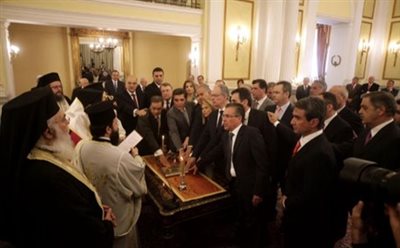 Ο αρχιεπίσκοπος Ιερώνυμος, που όρκισε τα μέλη του νέου κυβερνητικού σχήματος, ευχήθηκε “καλή δύναμη”, και κατόπιν οι υπουργοί υπέγραψαν, σύμφωνα με το έθιμο, με πρώτο τον νέο “τσάρο” της Οικονομίας, Γκίκα Χαρδούβελη.