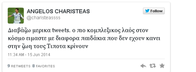 Εκνευρισμένος με την κριτική των Twitterάδων εμφανίστηκε ο Άγγελος Χαριστέας, ο οποίος με ένα σκληρό μήνυμα, απάντησε στα πολλά και αρκετά από αυτά ειρωνικά σχόλια, κατά της Εθνικής μας ομάδας, μετά τη χθεσινή της εμφάνιση.