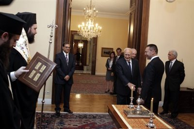 Πριν ξεκινήσει η ορκωμοσία τα χαμόγελα περίσσευαν. Ο Γκίκας Χαρδούβελης ήταν φανερά ευδιάθετος παρατήρησε μάλιστα το ύψος του επισκόπου Διαυλείας Γαβριήλ και είπε πως “η Εκκλησία δείχνει το ύψος των δυσκολιών” για να απαντήσει κοιτάζοντας προς τον Γιάννη Στουρνάρα ο επίσκοπος ότι “καλά τα πήγε” με τον Γιάννη Στουρνάρα να σχολιάζει... “είναι αυτό που λέμε: δώσαμε, δώσαμε...” λέγοντας αργότερα στους δημοσιογράφους ότι εννοούσε ότι ο λαός έδωσε και έτσι υπήρξαν καλά αποτελέσματα.