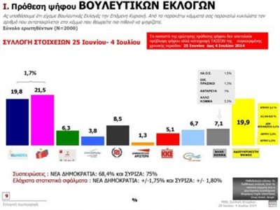 Στην εκτίμηση ψήφου εκλογών τα ποσοστά των κομμάτων είναι τα εξής: ΣΥΡΙΖΑ 26,8%, Ν.Δ. 24,7%, Χρυσή Αυγή 10,6%, «Το Ποτάμι» 8,4%, Ελιά 7,9%, ΚΚΕ 6,4%, Ανεξάρτητοι Έλληνες 4,7%, Δημοκρατική Αριστερά 1,6% και «Άλλο Κόμμα» 8,9%.