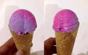 Το παγωτό είναι μπλε στο μπόλ, αλλά γίνεται ροζ και σιγά σιγά μοβ όταν έρχεται σε επαφή με τη γλώσσα.