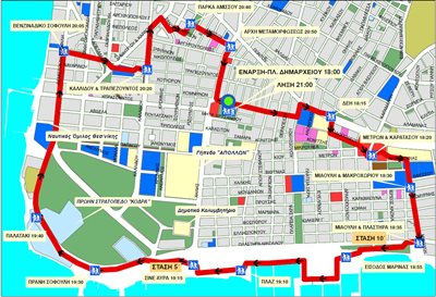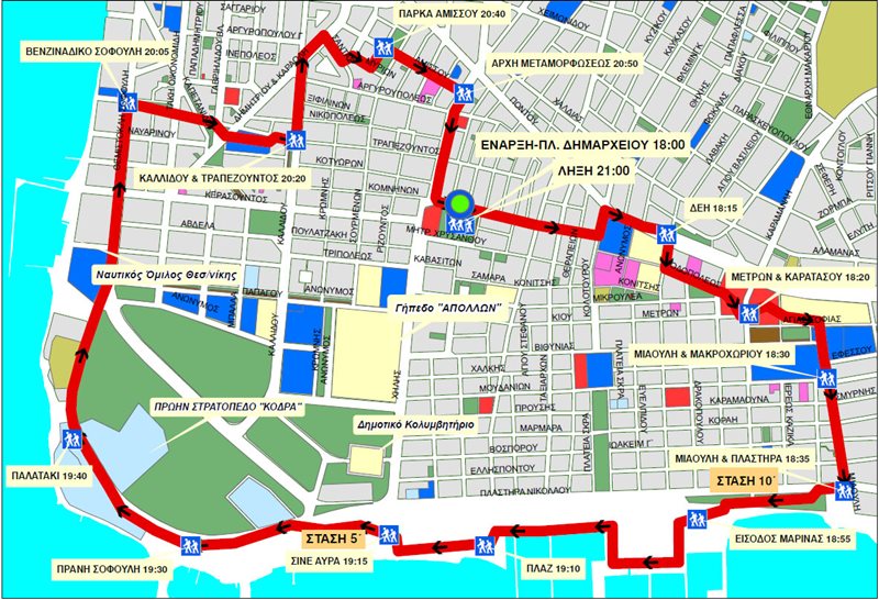 Αναλυτικά η διαδρομή : Οδικό ή μη δίκτυο του Δήμου Καλαμαριάς, με εκκίνηση Δημαρχείο Καλαμαριάς-Κομνηνών 58 ( Πλατεία Προσφυγικού Ελληνισμού) ακολουθώντας την εξής διαδρομή : Κομνηνών (Πεζόδρομος) ,Κολοτούρου ,Πόντου, Αγίου Νικολάου, Ροδοπόλεως, Αλάνα/ χωματόδρομος , Μιαούλη, Πλαστήρα- 1η Στάση ανάπαυλας δέκα λεπτών (10') (πάρκο), κίνηση κατά μήκος της Πλαστήρα - κάθοδος προς Μαρίνα Καλαμαριάς από φανάρι Πλαστήρα (αναψυκτήριο Δήμου) - μαρίνα Καλαμαριάς - προς χώρο στάθμευσης αυτοκινήτων πλαζ Αρετσούς, 2η Στάση ανάπαυλας πέντε (5) λεπτών στο χώρο στάθμευσης αυτοκινήτων της Πλαζ Αρετσούς μπροστά από το θερινό σινεμά «Αύρα», άνοδο προς τη Θ.Σοφούλη (παλατάκι), Τραπεζούντος, Καλλίδου,- Δημητρίου & Καραολή - Σάντας- Μυρίων-Ματσουκαίων- Αμισού - Μεταμορφώσεως (Πεζόδρομος)-Κομνηνών(Πεζόδρομος) - Δημαρχείο Καλαμαριάς-Κομνηνών 58 ( Πλατεία Προσφυγικού Ελληνισμού).