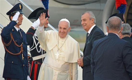Επίσκεψη στην Αλβανία πραγματοποιεί ο Πάπας Φραγκίσκος. Έφθασε στο αεροδρόμιο των Τιράνων με ένα Airbus A321 της Αlitalia, όπου τον υποδέχθηκε ο Αλβανός πρωθυπουργός Έντι Ράμα ο οποίος του χάρισε ενα κύπελλο με χώμα απο την Αλβανία.